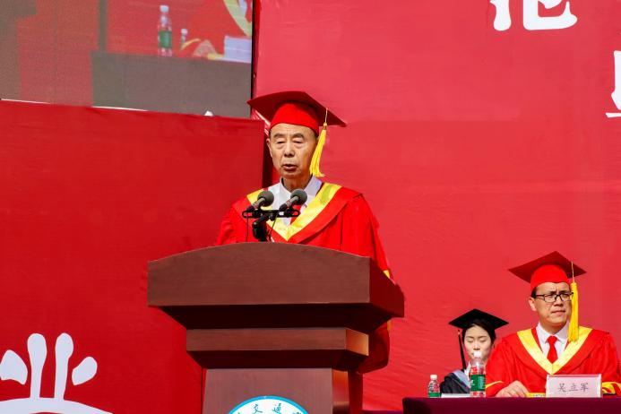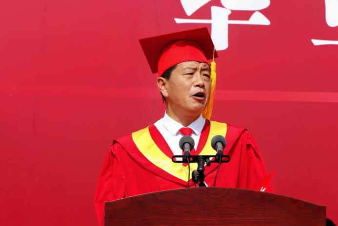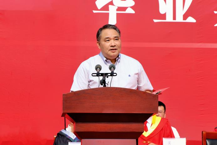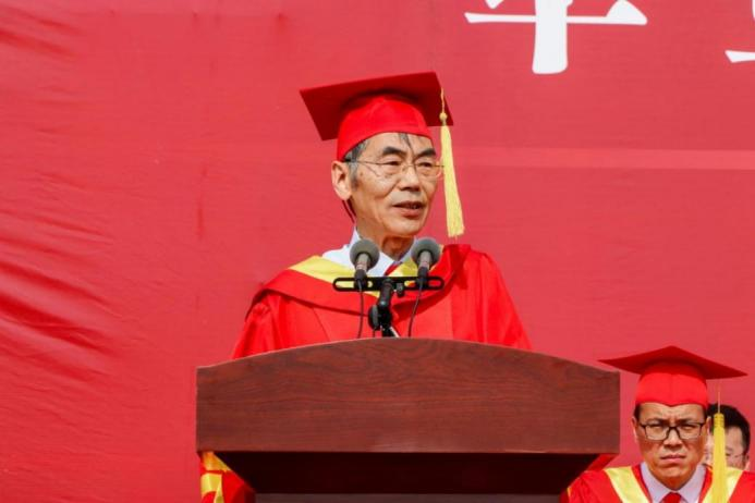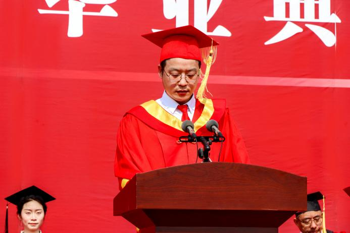 校长章梓茂代表学校向毕业生表示热烈的祝贺。他表示中国高等教育已进入普及化阶段,毕业生面临科技变革和全球化挑战,应具备历史责任感。他分析当下社会发展机遇与挑战,赠予同学们 “三心”——自信心、责任心、孝心 ,“两意”——意愿、意志 ,鼓励大家秉持校训,以实现个人和国家的现代化建设目标。