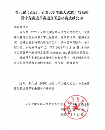 在总决赛中,同学们克服种种困难,稳定发挥,最终获得全国三等奖的好成绩,这一成绩的取得,不仅是对电子与电气工程学院参赛学生专业素养与创新能力的体现,也是在嵌入式芯片与系统设计相关专业教育教学成果的有力彰显,更是学校积极推动学科竞赛、以赛促学教育理念的成功实践。