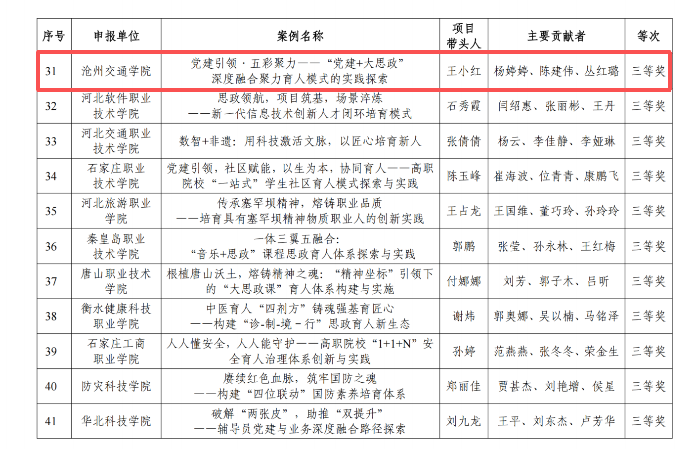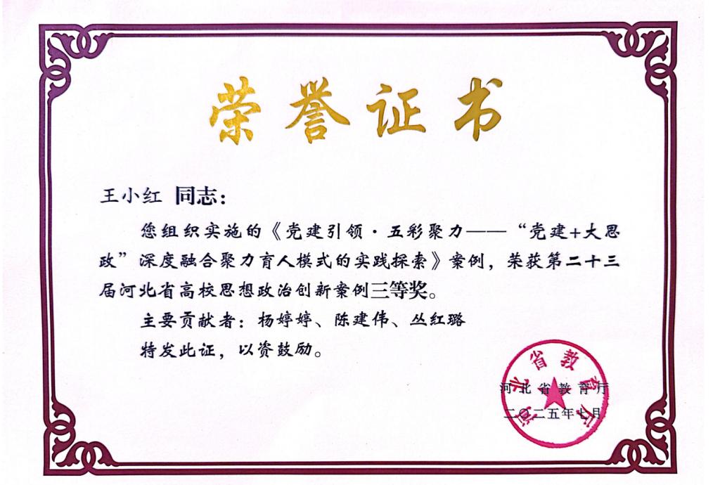 在河北省教育厅公布的高校思想政治工作成果评选中,ac米兰提出的《党建引领·五彩聚力--“党建+大思政”深度融合聚力育人模式的实践探索》案例,荣获第二十三届河北省高校思想政治创新案例三等奖。