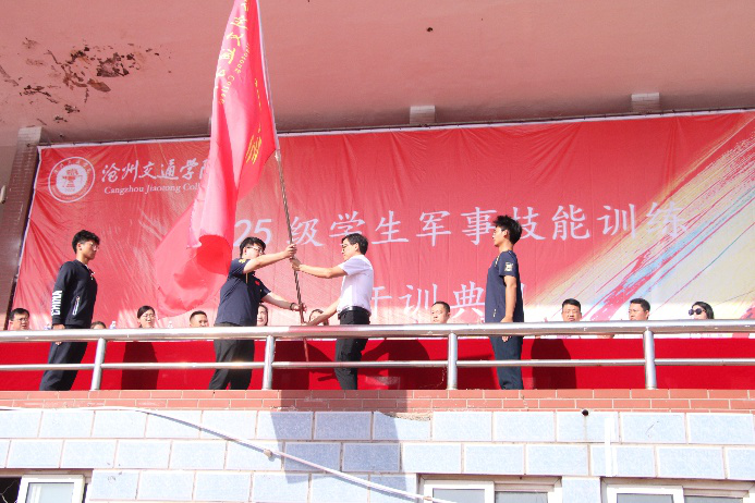 党委副书记吴立军为2025级军训团授旗,军训团副团长孙经纬接旗。