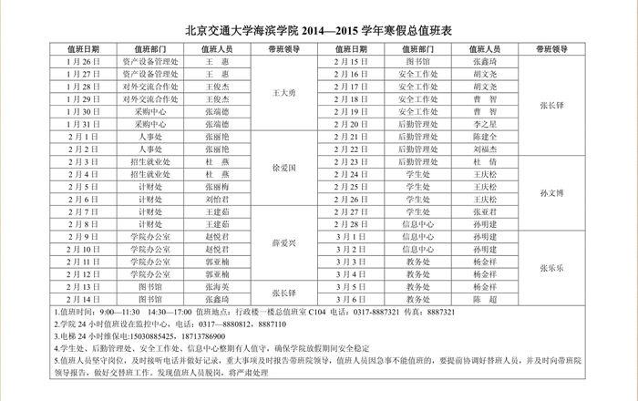 北京交通大学海滨学院行政值班表(1月)