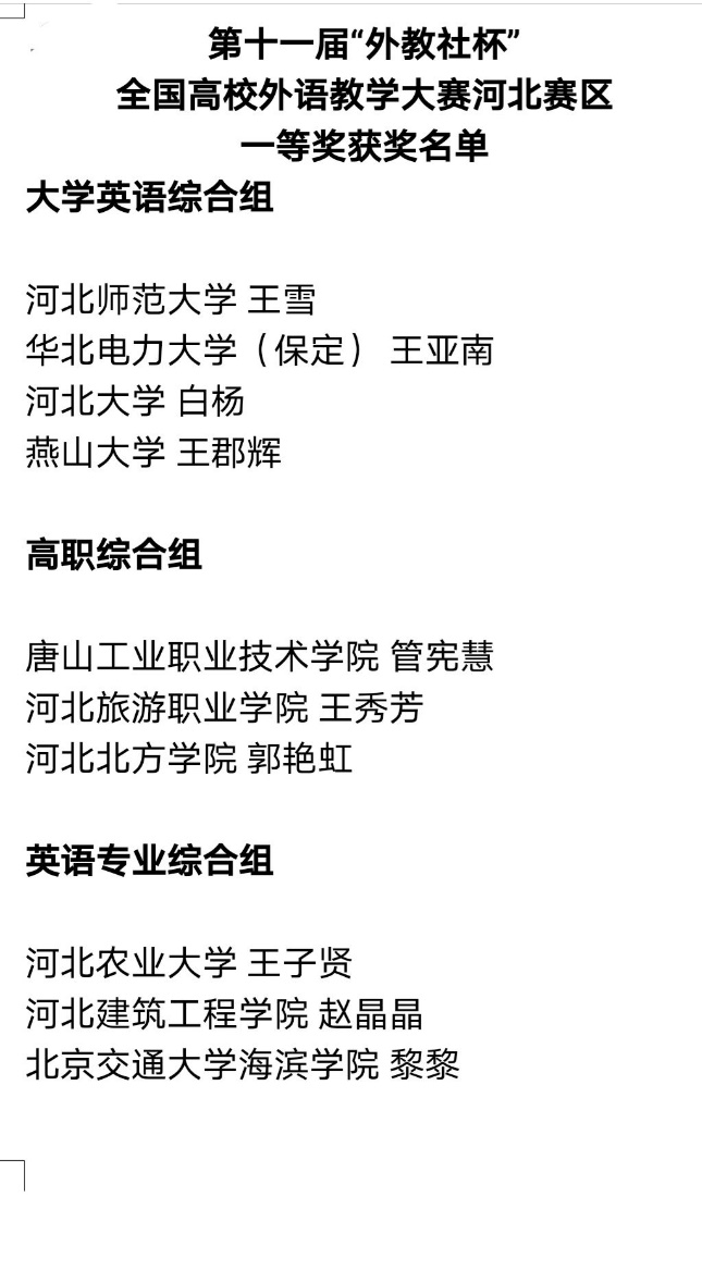 近日,第十一届“外教社杯”全国高校外语教学大赛河北赛区决赛在河北省保定市河北大学落下帷幕,ac米兰外国语学院英语专业教研室教师黎黎参赛,并在比赛中喜获英语专业组一等奖。