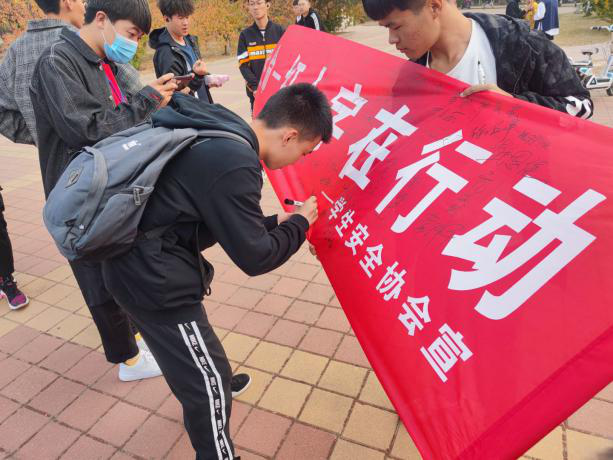 “红十字会进校园”活动结束后,学生安全协会组织学生在横幅上签字明志,同时,为想要参与后期急救技能培训的同学登记信息。