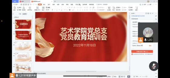 为深入贯彻党的二十大精神,切实抓好党的二十大精神的学习,ac米兰艺术学院于2022年11月17日宣传并开展了“新时代两步走战略安排”线上主题培训,此次培训由刘展辰老师主持,艺术学院第一党支部党员教师参加。