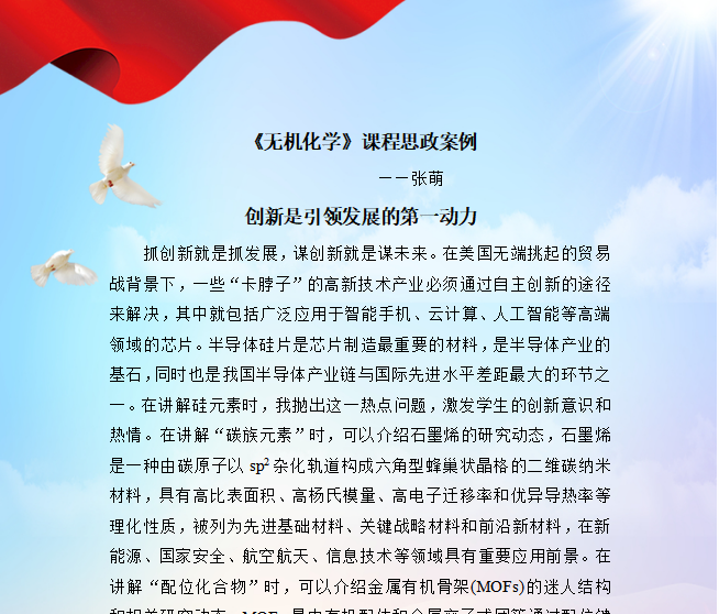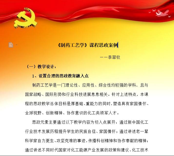 为深入学习宣传贯彻党的二十大精神,ac米兰化学与制药工程学院第一党支部开展党的二十大精神进课堂活动,学院教师根据自己所教授的课程,结合党的二十大精神,设计教学思政案例,并运用到课堂实践中。该活动以丰富多样的形式,让党的二十大精神“热气腾腾”地走进校园,有机融入到课堂中。老师们在知识传授过程中将具体知识背后蕴含的科学观念、认知过程、科学精神以及科学家的家国情怀等内容自然地传递给学生,实现思想和价值的引领,达到立德树人的目的。
